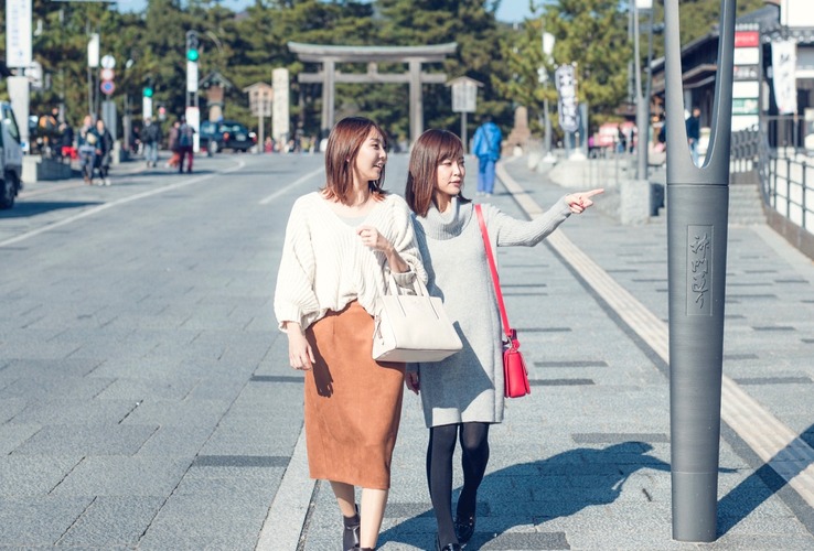 一際目立つ大きな鳥居から出雲大社参道入口まで続く約700mの表参道「神門通り」。