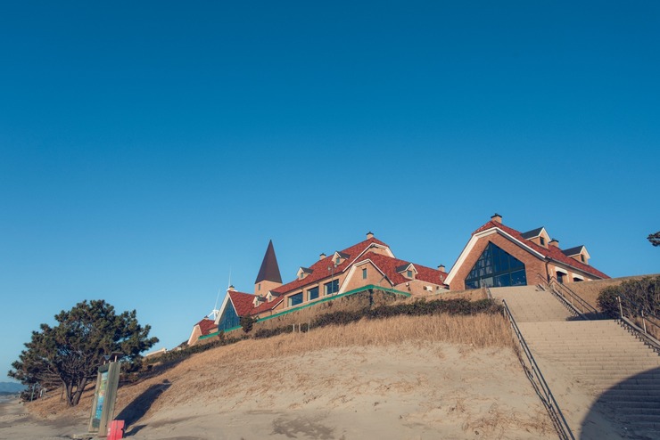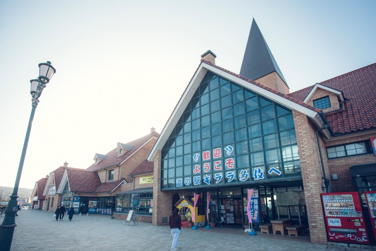 真っ青な空と日本海を背にたつ、北欧風のメルヘンチックな建物が印象的な道の駅「キララ多伎」。