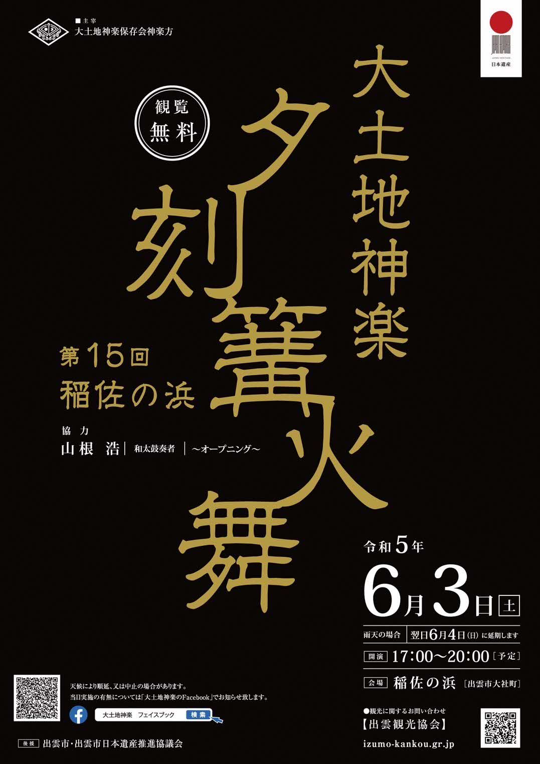 その継承者である大土地神楽保存会神楽方の皆さんが、1人でも多くの人に出雲の伝統芸能の素晴らしさに触れていただき、地域ぐるみで保存継承につなげようと企画された「稲佐の浜夕刻篝火舞」